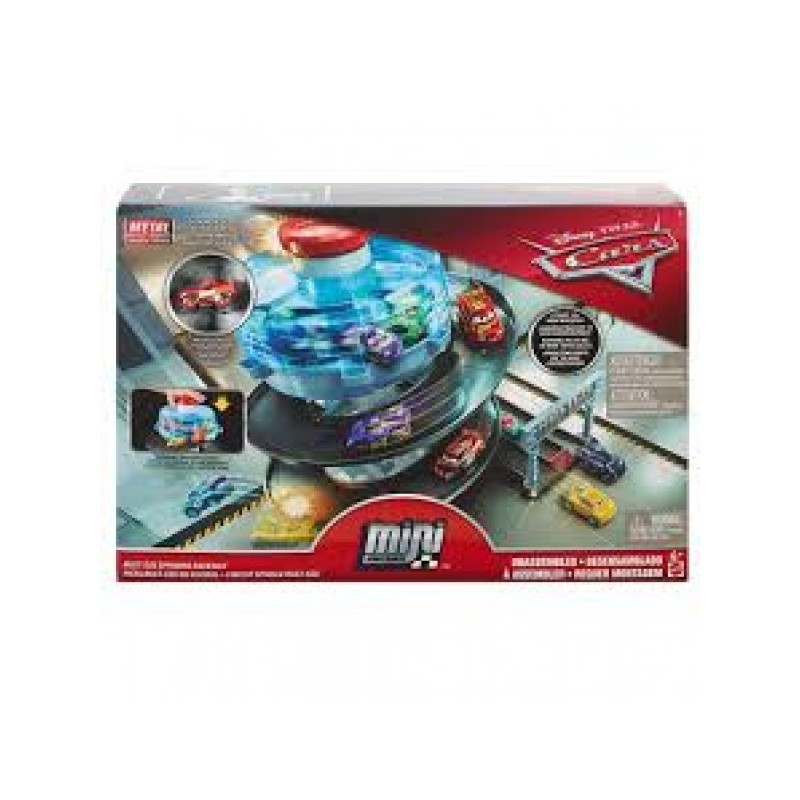 Este juego de Disney Pixar's Cars Mini Racers contiene acción única y emocionantes giros. Coloque a sus mejores competidores en la parte superior del curso en espiral, y luego bombee, bombee, bombee el botón rojo. ¡Los mini vehículos explotarán a alta velocidad! Mira a los autos correr y dar vueltas por el campo mientras se mueven por los baches en el camino. Intenta evitar el desvío y la pared de choque o saldrás de la pista y perderás la competencia. Este veloz conjunto de refrescos almacena hasta 12 Mini Racers y es compacto para almacenamiento y diversión sobre la marcha. Incluye Mini Rayo McQueen. Otros vehículos Mini Racer se venden por separado.