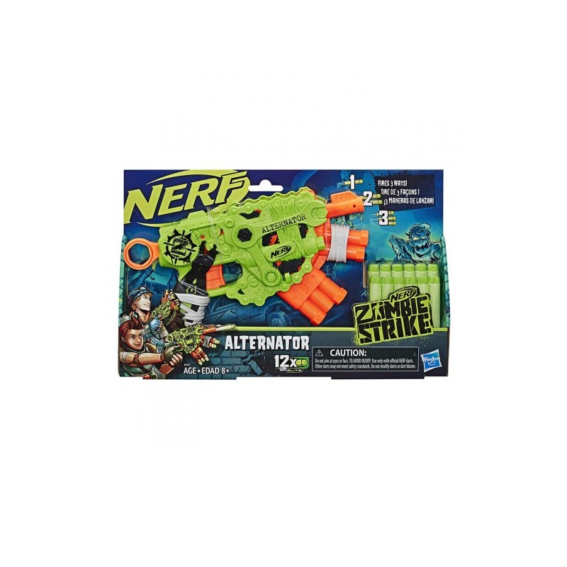 Nerf Zombie Strike Alternator; ¡Lanza dardos de 3 maneras distintas con el lanzador Alternator de Nerf Zombie Strike! Este lanzador tiene 3 cañones que puedes posicionar con facilidad para elegir cuántos dardos quieres lanzar: 1, 2 o 3 dardos a la misma vez. Los cañones se mueven manualmente y están conectados al lanzador, así que no hay piezas separadas que deben ser intercambiadas; simplemente mueve los cañones hacia arriba o abajo para elegir el que quieres usar. El lanzador tiene capacidad para 6 dardos y viene con 12 dardos Nerf Zombie Strike Elite oficiales, con los cuales puedes cargar los 3 cañones y así estar siempre listo. Los dardos Nerf oficiales han sido probados y aprobados para un alto rendimiento y calidad, y están hechos de espuma con puntas flexibles y huecas, ¡así que son perfectos para combatir contra los zombis tanto dentro de la casa como al aire libre! Lanzador de recarga manual (no requiere baterías).