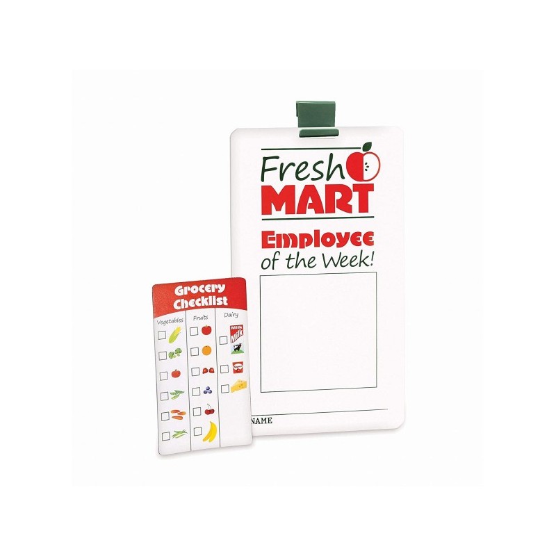 Los artículos para juego de imitación incluyen: delantal, barra divisora de banda transportadora, bolsa de compras, dinero de juguete, tarjetas, cupones