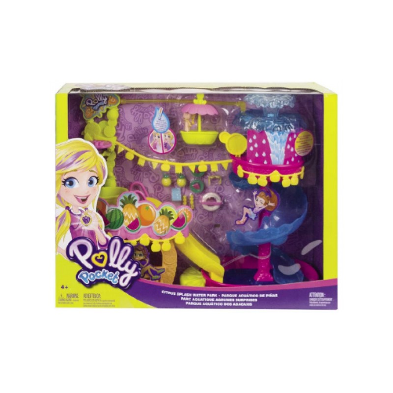 Parque Acuático de Piñas Polly Pocket Prepárate para la diversión más espectacular con el parque acuático Polly Pocket ™ Citrus Splash! ¡Este colorido juego presenta colores brillantes y festivos e incluye actividades divertidas que realmente causan sensación! ¡El lindo tranvía con paraguas del Water Park lleva la muñeca Polly ™ de 3 pulgadas al gran tobogán de agua sinuosa que funciona con agua real! Simplemente llene la piscina y presione el botón para bombear agua a la parte superior. Luego, suelta el botón y el agua y la muñeca Polly ™ bajarán por el tobogán circular hacia la piscina. Whoosh, ¡qué divertido! ¡La muñeca Polly ™ también puede tomar el otro tobogán (encima del soporte para batidos) y aterrizar en la piscina también! Llena la piscina con agua tibia, coloca la muñeca Po